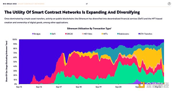 像以太坊这样的公链上的活动曾经被简单的资产转移所主导,现在已经多样化到去中心化的金融服务(DeFi)和基于NFT的数字商品的创造和所有权,以及其他应用。