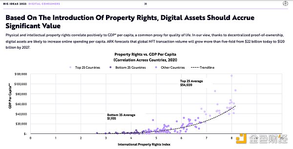 物理产权和知识产权与人均GDP呈正相关,这是生活质量的一个常见代表。在我们看来,由于去中心化的所有权证明,数字资产可能会增加人均在线支出。ARK预测,全球NFT交易量将从现在的220亿美元增长到2027年的1200亿美元,增长超过5倍。