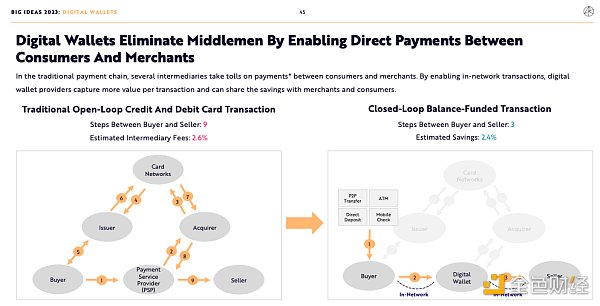 剔除中间商,数字钱包可以促进50%以上支付量的闭环交易,到2030年,在目前1万亿美元的数字钱包企业价值基础上,可能增加4500亿美元。