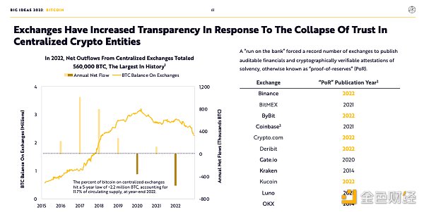 2022年,中心化交易所的净流出量达到56万个BTC,是历史上最大的一次。