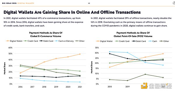 2021年,数字钱包促成了49%的电子商务交易,高于2016年的18%。自2016年以来,数字钱包一直在以牺牲信用卡、银行转账和现金为代价获得份额。