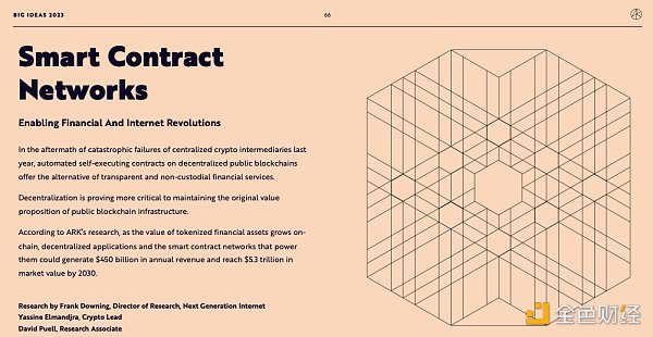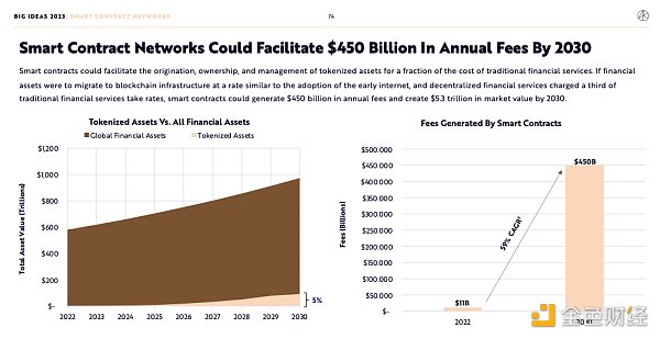 根据ARK的研究,随着代币化金融资产在链上的价值增长,去中心化应用和为其提供动力的智能合约网络可以产生4500亿美元的年收入,到2030年达到5.3万亿美元的市场价值。