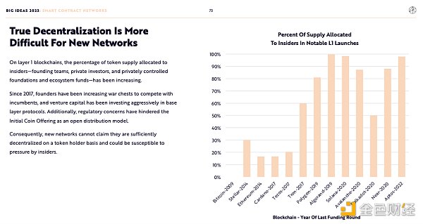在1层区块链上,分配给内部人员--创始团队、私人投资者以及私人控制的基金会和生态系统基金的代币供应比例一直在增加。自2017年以来,创始人一直在增加战利品以与孵化器竞争,而风险资本一直在积极投资于基础层协议。此外,监管方面的担忧阻碍了首次代币发行作为一种开放的分发模式。因此,新的网络不能声称他们在代币持有人的基础上充分去中心化,并可能容易受到内部人的压力。