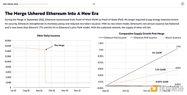 在2022年9月的合并期间,以太坊从工作证明(PoW)过渡到权益证明(PoS)。不再需要向能源密集型矿工支付安全费用,以太坊加强了其货币政策,并减少了新代币的发行。在新的代币模式下,以太坊的年净发行量已经趋于平缓,现在低于比特币的1.7%和以太坊之前PoW模式的4%。随着网络的持续发展,以太坊的供应量将下降。