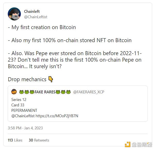 例如,艺术家、数据科学家和 NFT 历史学家 Chainleft 于 2022 年 11 月在当前的 Ordinals 热议之前铸造了 PEPERMANENT,这是一个完全在链上的比特币 NFT 实验。