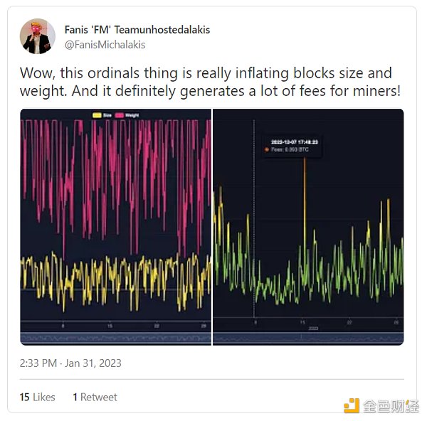 与之相反的是,曾参与 Counterparty 的人和新老实验者都称赞 Ordinals 的方法可能对比特币 NFT 领域的未来发展产生革命性影响。此外,这些新的 NFT 显著提高了比特币矿工的交易费收入,可能为未来指明了方向——文化活动将有助于取代比特币不断减少的区块补贴。