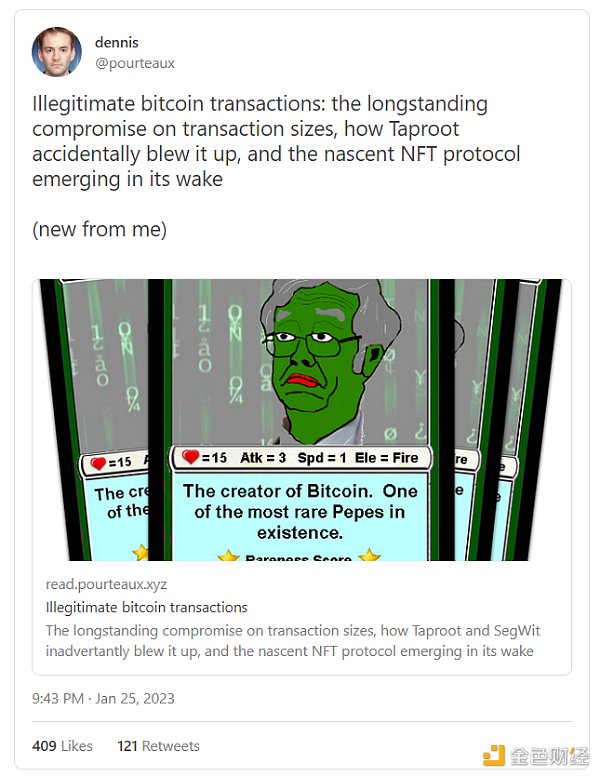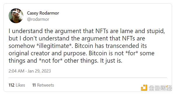 “我理解有人认为 NFT 很差劲、很愚蠢,但我不理解有人认为 NFT 在某种程度上是‘不合理的’。比特币的发展已经超越了其最初的创造者以及其最初的目的。比特币并非仅用作某些东西或者其他东西。比特币就是比特币。(指人们有权用比特币做任何事)”