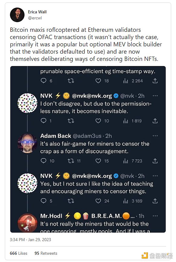 “比特币最高主义者曾指出以太坊验证者审查 OFAC 交易(实际上并非如此,主要是验证者默认使用 MEV 区块构建器,它很流行,但是否使用是非强制的),现在却在考虑审查比特币 NFT 的方法。”