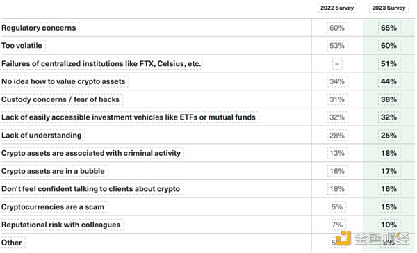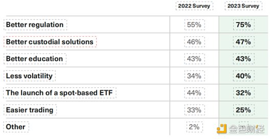 监管仍然是最大的障碍,但其重要性在 2022 年动荡的新闻流中飙升:75% 的顾问将「更好的监管」称为提高他们对加密资产配置信心的关键一步,高于前一年的 55%。另一个因素是波动性:40% 的人希望看到波动性降低,而前一年这一比例为 34%。今年的结果不太突出:推出基于现货的 ETF(32% 对前一年的 44%)和更容易的交易(25% 对前一年的 33%)。