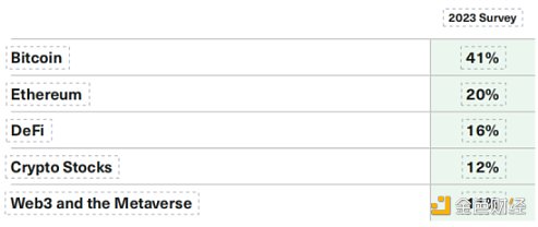 比特币等个人加密资产是下一个首选敞口 (17%),高于多元化加密资产基金 (10%),个人加密公司股票排在最后为 4%。