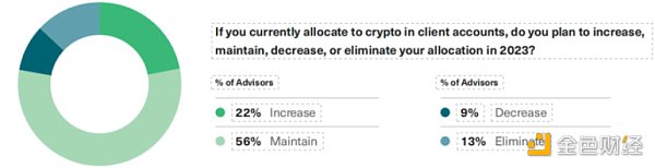 另一个有说服力的发现是,已经在客户账户中配置给加密货币的顾问与没有分配给加密货币的顾问之间的态度存在差异。在那些没有为客户配置加密资产的顾问中,74% 要么不打算在 2023 年增加敞口,要么仍在权衡利弊。另一方面,已经在客户账户中配置加密货币的顾问中有 78% 计划维持或增加风险敞口。这表明已经接触过加密货币的顾问可能更了解加密货币的机会和风险,而那些没有接触过的顾问可能会被 2022 年的加密货币寒冬所排斥。
