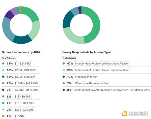 Bitwise/VettaFi 2023 年财务顾问对加密资产态度基准调查的目标是衡量美国财务顾问对加密市场的看法,包括他们是否认为将客户资产分配到该领域是合适的。调查旨在对来自全美各地的不同类型顾问进行交叉抽样,包括独立注册投资顾问 (RIA)、经纪自营商代表、财务规划师、金融服务公司代表和机构投资者。展开调查的时间为 2022 年 11 月 25 日至 2023 年 1 月 6 日。