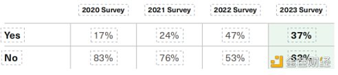 报告在个人投资组合中拥有加密资产的顾问比例从 2022 年调查的 47% 降至 37%。尽管如此,这仍大大高于 2020 年 (24%) 或 2019 年 (17%)。