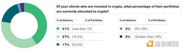 在客户账户中配置加密货币的顾问中,绝大多数 (95%) 在客户投资组合中持有加密货币的权重为 5% 或更低。