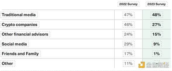 当顾问被问及他们如何了解加密货币时,传统媒体仍然是 48% 的首要来源,而 2021 年这一比例为 47%。但我们调查中的所有其他类别都同比下降,有些下降幅度很大:加密货币公司从 46% 下降 2021 年下降到 2022 年的 27%,其他财务顾问从 24% 下降到 15%,社交媒体从 29% 下降到 9%,朋友和家人从 17% 下降到 1%。结果表明,在丑闻缠身的一年里,顾问们求助于官方媒体,以了解其他来源。