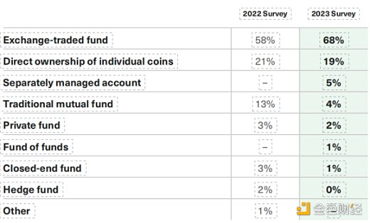尽管如此,就投资工具而言,顾问仍然强烈偏好 ETF:68% 的顾问表示,这将是他们持有加密货币的首选方式。此外,ETF 相对于传统共同基金的优势包括费用、可交易性、透明度等似乎越来越受到顾问的青睐,只有 4% 的人选择共同基金,而 2022 年这一比例为 13%。