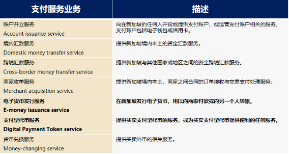 2020 年 1 月修订后生效的《支付服务法》(Payment Services Act,PSA)负责监管规范新加坡支付服务业务,包括传统的支付业务,如开户服务、汇款服务、货币兑换服务等,也包括了新兴的支付业务,如电子货币(eMoney)发行服务和支付型代币(Digital Payment Token, DPT)服务。