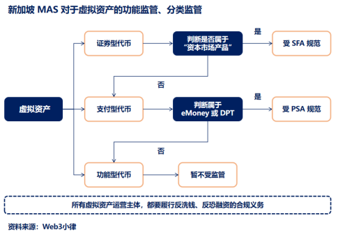 对于虚拟资产的监管主要参考 MAS 于 2020 年 5 月发布的《数字代币发行指南》(A Guide to Digital Token Offerings),该指南代表了新加坡对 Web3 的主要监管思路,明确证券型代币以及支付型代币由两部专门法规监管,功能型代币并未受到监管。《指南》为虚拟资产在新加坡的合法化提供了重要的法规依据。除此之外,所有从事金融活动的主体,包括虚拟资产服务商,都需要履行反洗钱和反恐融资的相关合规义务,以监测和阻止非法资金流入新加坡的金融体系。