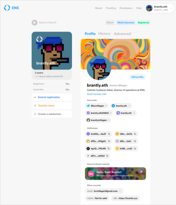 域名和钱包都可以视作身份管理容器:钱包可以用一个域名作为钱包账户名的替代,并将其作为和应用方交互时的「姓名」,同时域名可以整合多个链上地址甚至多个钱包账户,它也是天然的身份聚合器。