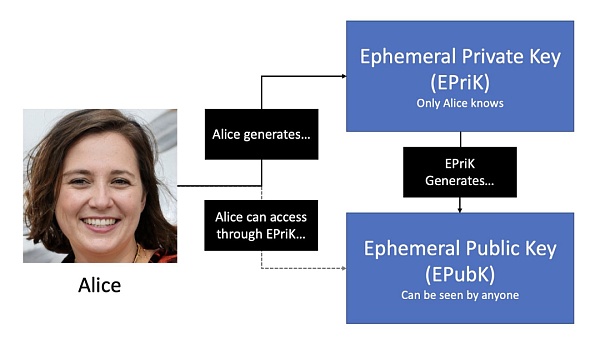 临时公钥是临时私钥生成的,就类似于助记词生成以太坊地址。临时公钥可以发到任何人都可以查看的公共分类账。临时密钥对只使用一次,因此Alice如果想与其他人进行交易,则必须生成新的临时密钥对。