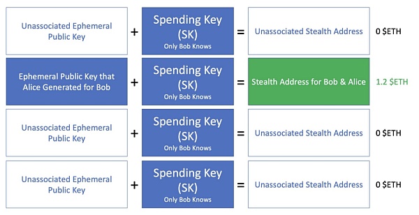 为了找到Alice的临时公钥,Bob需要浏览所有现有临时公钥的列表。把看到的每个临时公钥,与自己的支出密钥结合起来,就会创建出一个由此产生的隐身地址。Bob查看隐身地址中可用的加密货币。在大多数情况下,使用随机临时公钥和Bob的支出密钥创建出的隐身地址当中应该会包含0ETH,但只要和Alice的临时公钥结合起来,Bob就可以看到生成的隐身地址中包含1.2个ETH。