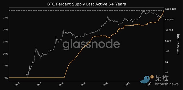在钱包中休眠了五年或更长时间的代币占总供应量的百分比在本周末创下了 27.85% 的历史新高。传统上处于休眠状态的 BTC 的数量也达到了五年来的最高水平。