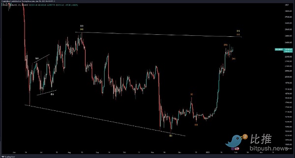 截至 1 月 27 日,阻力位分别位于 23,200 美元、24,500 美元和 25,000 美元。比特币交易员Crypto Tony表示“25,000 美元的目标在望。”