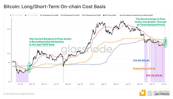 Glassnode 数据显示,自 COVID-19 黑天鹅事件和 2018-2019 年熊市以来,BTC 首次突破三个投资者成本基础线,即“已实现价格”(realized price),该指标可以通过已实现市值(Realized capitalization)来计算。