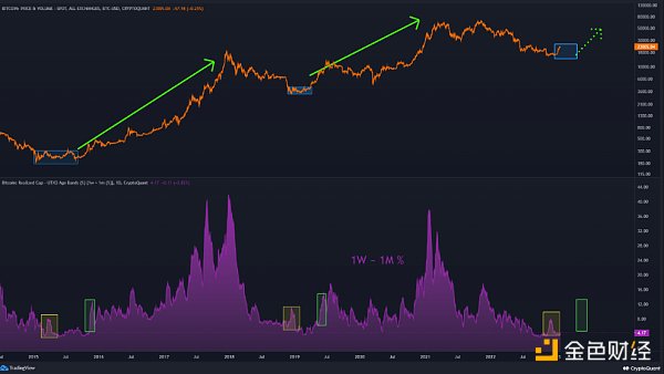 该分析主要基于比特币交易量的增加和供应的移动,在长期下降趋势中移动并触底后,上图显示一周至一个月供应的活动增加,从而触发横向移动的开始。根据链上指标,市场正在重演我们在 2021 年和 2017 年看到的趋势。底部的供应已经开始移动,比特币在经历了长期的下跌趋势后出现了逆转。