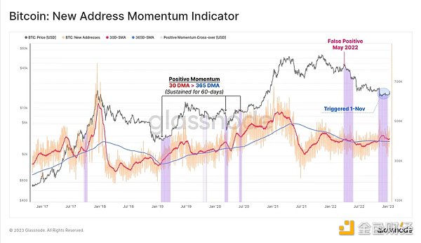 指标:当新地址的 30D-SMA 越过 365D-SMA,并维持至少 60 天,它标志着网络增长和活动正在积极上升。