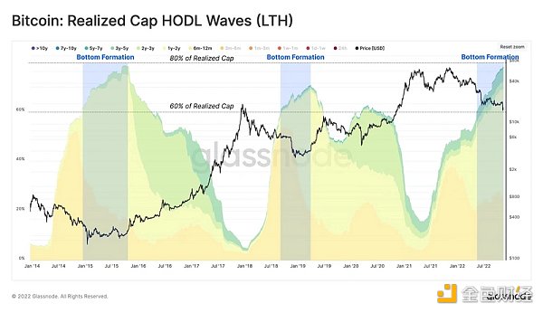 第一个观察结果是,持有比特币至少 6 个月的投资者群体通常在实现上限后期熊市中持有量变成 60% - 80% 。因此,我们将选择 0.7 的倍数,并将其作为实现价格的砝码。这是对最低估值的一种衡量,它代表了拥有“最坚定控制力”的投资者。