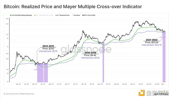 指标:从历史数据上看,实现价格* 0.7 和 200 D-SMA * 0.6 定价模型之间的交集发生在深熊阶段。这是由于投资者堆积导致链上交易量加权实现价格稳定的结果, 200-DMA(200 天的平均差指标)而未加权 200-DMA(200 天的平均差指标)由于宏观价格下降趋势而继续下降。