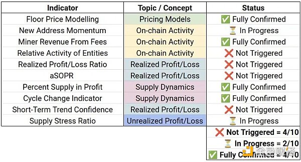 下面是截至本文发布时这 10 个指标的汇总表。比特币市场尚未触发大多数这些指标,但我们可以根据这 10 个指标来追踪新趋势的发展。