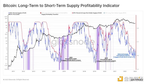 指标:由于熊市低点时大量的供应再分配,与长期持有者相比,新买家持有的供应百分比往往对价格非常敏感。因此,当供应占利润的比例超过长期持有者时,通常意味着近几个月发生了大规模的供应再分配。