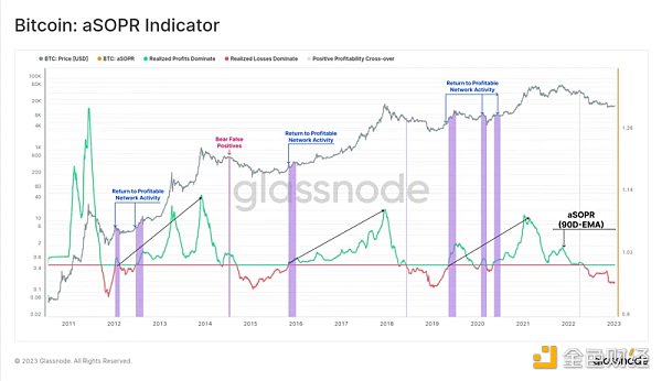 指标:aSOPR 的 90D-SMA 恢复到 1.0 以上,这表明宏观趋势转变回到了盈利的链上支出。这表明很大一部分链上市场活动是盈利的。