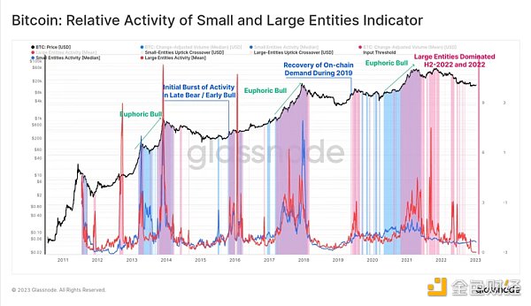 指标:熊市往往会导致各种规模实体的链上活动显著下降。高于 1.2 的值往往定义了初始复苏和链上需求水平升高的阈值。因此,小型和大型实体的恢复均超过 1.2 ,这表明网络需求正在全面复苏。