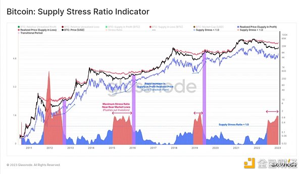 在达到周期最高价(ATH)后,市场进入需求恶化阶段,以未实现损失持有的净财富增加。我们可以通过供应压力比率来衡量整个市场的经济压力。