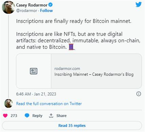 该协议被称为“Ordinals”,由软件工程师 Casey Rodarmor 创建,他在 1 月 21 日发表博文后正式在比特币主网上启动了该程序。