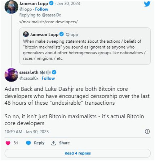 其中包括 Twitter 用户“Bitcoin is Saving”,他 1 月 29 日向他们的 237,600 名追随者争辩说 ,想要使用 JPEG 作为身份象征的“特权富裕白人”可能会将边缘化人群排除在参与比特币网络之外。