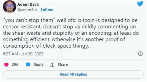 Blockstream 首席执行官和比特币核心开发人员 Adam Back 等其他人对将模因文化引入比特币并不满意,建议开发人员将“愚蠢”带到别处: