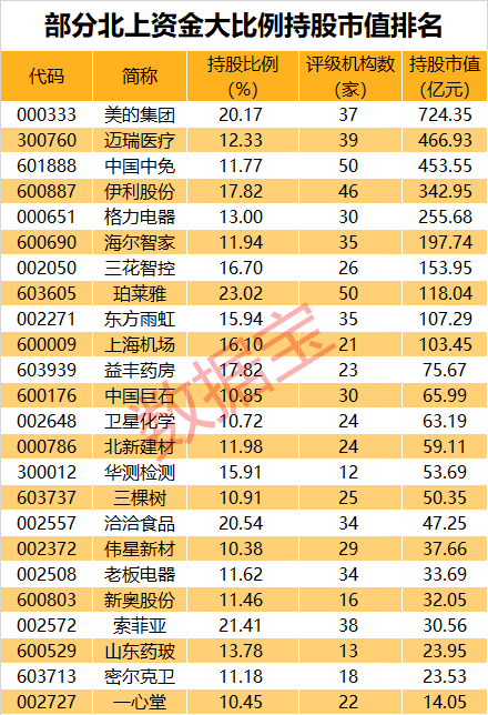 数据宝统计出10家以上机构评级的大消费股票,合计有20多股获得北上资金大举重仓。从持股市值角度看,北上资金持股美的集团最多,超过724亿元。此外,迈瑞医疗、中国中免、伊利股份、格力电器等个股持股市值均超过百亿元。