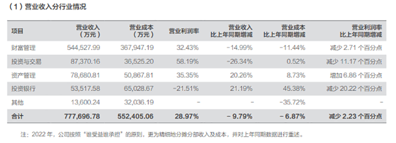 方正证券通过高配债、低配股,在自营投资业务方面逆势逆行业跑赢,支撑了全年业绩。以“投资收益 公允价值变动-对联营/合营企业投资收益 利息收入中其他债权投资利息收入=自营投资收益”的计算口径,截至2022年12月31日,方正证券实现自营投资收益22.33亿元。