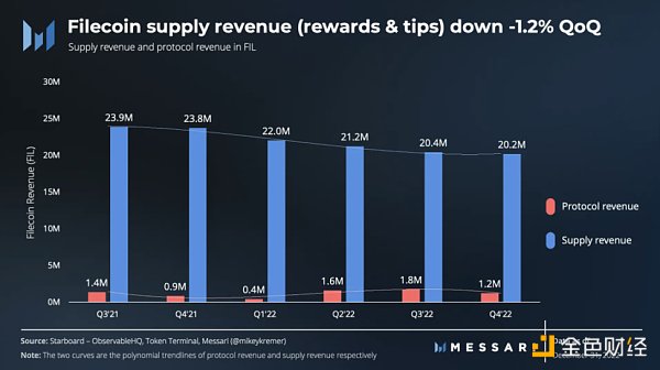 Filecoin 费用中唯一没有被协议燃烧的部分是区块矿工收集的「小费」,以加速网络供应方的交易。因此,这笔「小费」算作供应方收入。 Filecoin 的供应方收入包括支付给存储提供商的代币奖励(占 Q4'22 供应方收入的 99.97% 以上),而「小费」只占一小部分。