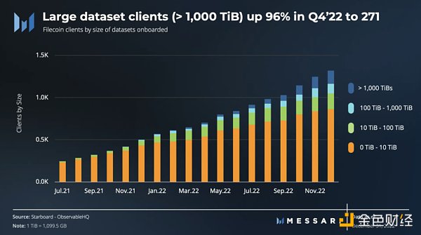 到 22 年第四季度末,共有 1,320 个客户在 Filecoin 上使用了数据集,其中 271 个客户使用了大型数据集(例如,存储大小超过 1,000 TiB 的数据集),比第三季度的 138 个客户增加了 96% 22. Filecoin 的客户范围从纽约市和 USC Shoah Foundation,到 OpenSea 等 Web3 平台。将数据载入 Filecoin 网络的其他值得注意的用例包括: