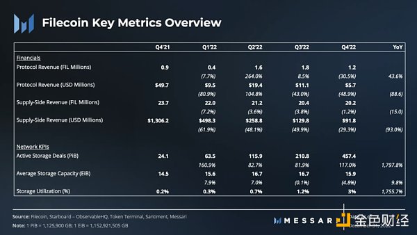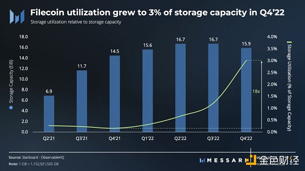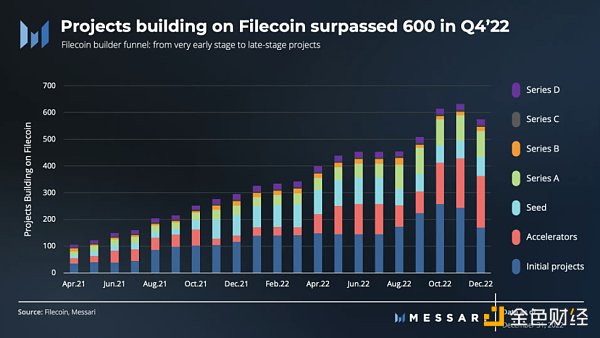 22 年第四季度标志着 Filecoin 使用量的上升,因为活跃的存储交易环比增长了 10%。虽然存储容量从历史最高水平下降了 5%,但存储利用率的增长速度比存储容量同比增长快 18 倍。虽然去中心化存储仍处于早期阶段,但 Filecoin 生态系统仍在蓬勃发展,目前有 600 多个项目正在 Filecoin 上构建。