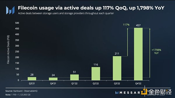 接近零的存储费用可能进一步鼓励通过交易增加数据存储。到 22 年第四季度末,超过 231 个 piB 通过活跃的交易存储在 Filecoin 网络上——比上一季度增加了 10%。自 21 年第四季度以来,这种积极的增长趋势一直在持续,因为 Filecoin 的活跃交易同比增长了 850%。