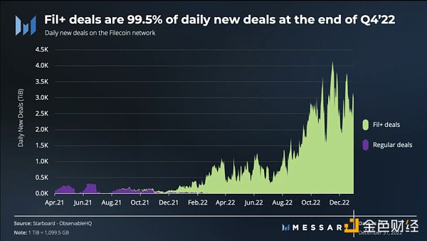 为了激励使用真实数据进行这些存储交易并防止网络奖励游戏,引入了 Filecoin Plus (Fil ) 计划。 Fil 通过增加存储提供商赢得区块奖励的可能性,为参与经过验证的交易提供更多奖励。这导致存储供应商削减竞争供应商的费用。因此,在 22 年第 4 季度,存储几乎没有成本。