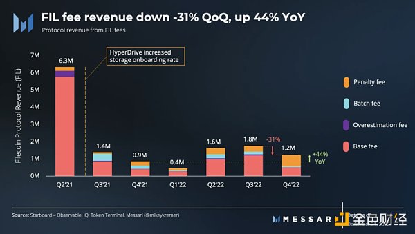 与 2021 年 7 月 HyperDrive 网络升级前相比,Q4'22 的 FIL 协议收入继续相对较低。通过聚合存储证明,HyperDrive 使存储上线率提高了 10-25 倍。虽然 HyperDrive 升级使网络参与者受益——通过减少拥塞和释放区块空间——但它也导致整体交易费用降低。因此,HyperDrive 升级导致过去四个季度的协议收入下降。