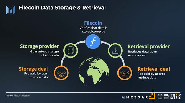 存储交易就像一份带有服务水平协议 (SLA) 的合同——用户向存储提供商支付费用以在指定期限内存储数据。为了保证数据安全,Filecoin 使用加密经济激励模型,定期使用零知识证明验证存储。为了激励存储提供商参与交易,Filecoin 使用网络的原生代币 FIL 奖励他们。如果数据无法检索或存储失败,存储提供商也会被罚没。