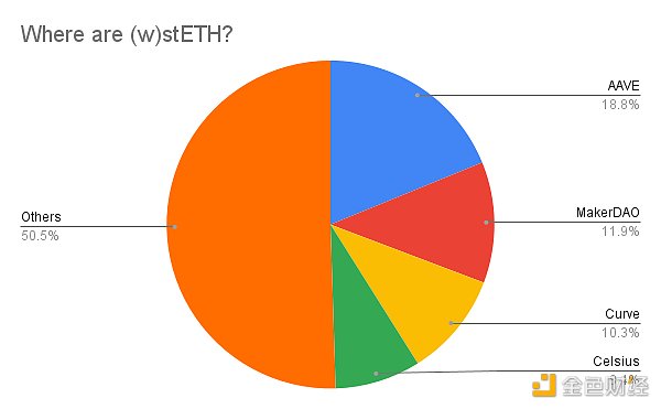 首先我们来看下当前的具体数据 。对于还没有开启 unstake,价格波动较大的 stETH,目前有 31% 在 AAVE/ MakerDAO 两大借贷协议上,还有少量在 Compound/ Euler 等借贷协议上,纵使潜力尚未被完全挖掘,也稳坐 stETH 第一大应用场景了,毕竟即使 Curve 也仅占 10%。